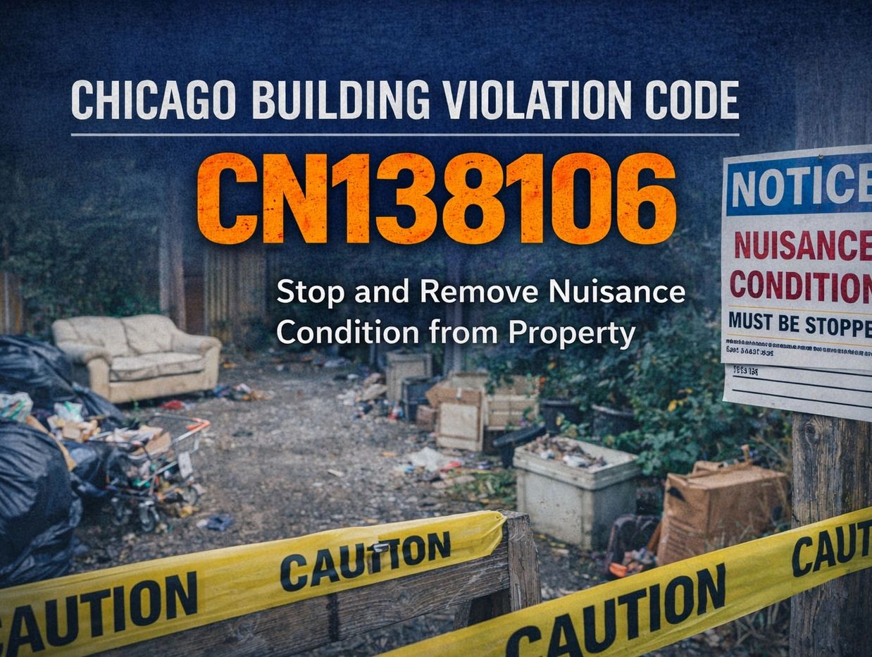 If you received a Chicago building violation labeled CN138106, the City is saying there’s a nuisance condition on (or connected to) the property that must be stopped and removed.